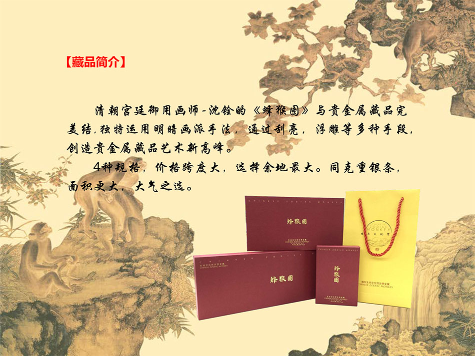 蜂猴图结合贵金属本身具备的价值感和金属光泽,更是成为2016年猴年最贵气的祝福。