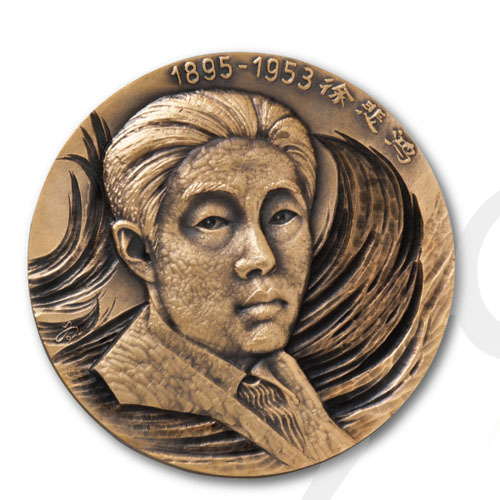 设计说明:正面图案:徐悲鸿像,背景饰以飘动的马尾,手工铜刻。背面图案:国画《群马图》局部、油画《田横五百士》以及素描《人体》,机器缩刻。