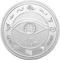 2000年发行的千年纪念金银币。背面图案有代表人类生存环境的十二个图标,其中月亮采用的是月牙里一条横线的象形文字造型。月亮对潮汐、地震、气候、生物活动都有影响,和太阳一样,关系着地球生命的存在和延续。新的世纪里,人类还将不断地探索月球,为造福后代子孙而努力。