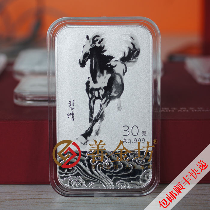 大师墨宝 权威监制徐悲鸿,中国现代美术事业的奠基者,杰出的画家和美术教育家,第一任中央美院院长、中国美术家协会主席。徐悲鸿的一生,以他伟大的爱国主义精神、杰出的艺术成就和对中国美术事业的卓越贡献,深为世人敬仰。徐悲鸿独特个性的绘画风格自成一派,尤其画马,堪称一绝。他对马的肌肉、骨骼以及神情动态,作过长期的观察研究。那刚劲矫健、精神剽悍的骏马,给人以自由和力量的象征,鼓舞人们积极向上。2012年徐悲鸿的《春山十骏图·镜心》拍卖价格高达1.05亿元;而在2011年他的《九州无事乐耕耘》更是以2.67亿元的天价,创下了中国画的世界纪录。徐悲鸿出生在江苏宜兴屺亭桥,“徐悲鸿纪念馆”就坐落在座落在宜兴亦园内,1988年开馆,著名书画家吴作人题写馆名。馆内常年陈列徐悲鸿生平介绍及其书画作品,并陈列有徐悲鸿的学生及当代著名书画家吴作人、李可染、黄胄、沙孟海、费新我等书画作品。宜兴徐悲鸿纪念馆第一次也是独家授权并监制了该款贵金属类纪念藏品,配合出品方用专业精神和对大师的敬仰之情为您呈现出该款生肖贺岁系列藏品。 该系列金银条精选了大师九幅最具代表性也是精神头最足的奔马图,利用先进的彩色造币工艺还原大师对“纸本墨马”的诠释,和金银的结合做到不失原作的气、神、力、韵。马下的祥云,采用镜面高浮雕的工艺,平衡构图的同时,低调的还原了金银最悦目的质感和尊贵的气质;然马踏祥云,凡马也就成了神马,吉祥倍增。金银条背面的“马到成功”四个字是由几百件徐悲鸿先生书法作品或手札中筛选提取后组合而成的,希望大师的“亲笔手书”能给您的贺岁祝福更添几分贵气!尤其一克、两克和五克金条,经过研发团队十几次的失败和攻坚,终于研发出了这套“超大幅面”浮雕金条,旨在将幅面尽可能的做大,而兼顾高浮雕、电砂、超镜等只有在正常厚度比例时才能做到的造币工艺;只为使大师作品和黄金质感的感观魅力发挥到极致!在装帧形式上力求简约实用。专利木盒上一个精巧的小设计使木盒包装兼顾了摆件展示的功能,独具匠心;木盒整体的双色漆和超薄设计与金银条浑然天成,庄重且不乏时代感。马在十二生肖中,位居第七,马属午,正是树木旺盛,万物欣欣向荣,充满生机的时刻。骏马身姿矫健,脚踏祥云,...