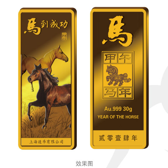 银蛇摆尾辞旧岁 福马呈祥报春来《易经》所载:“乾为马”,乃天之象征,乾卦又称龙卦,“龙马”一词由此而生,喻精进刚猛之意。龙不可遇,但龙马长存,作为中华民族的精神所向,马被人们赋予了圣贤与能者的情感色彩,也是王者风流和英雄精神的象征。民族精神 千年传承 中华民族自古便以“马”之形喻民族精神,其刚健、升腾、饱满、昌盛的象征意义,诠释了华夏子孙千百年来的精神面貌。甲午马年的到来,也因此被寄托了无限升腾的美好期许与昂扬斗志。宝泉钱币始终坚持并不懈努力以贵金属的表现形式、艺术品的典藏方式,继承、弘扬中国生肖传统,同事实现国粹经典文化的永久收藏。设计说明:正面图案:清朝宫廷画家郎世宁的绘画作品骏马造型,镌有“马到成功”等字样,局部彩色印制;背面图案:民间剪纸马造型,镌有书法“马”等字样。材质:.9999Au 规格:20*50毫米 重量:10克材质:.9999Au 规格:24*60毫米 重量:20克