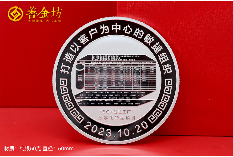 这枚纪念银章不仅是对三鑫“5G+智慧工厂”数字化转型项目的认可和纪念,更是对公司未来发展的期许和鼓舞。通过这次数字化转型,三鑫将进一步提升生产效率和管理水平,打造一个更加智能、高效、以客户为中心的现代化企业。银章所代表的60克纯银和99.9%的高纯度成色,象征着三鑫对卓越品质的不懈追求和对未来的无限信心。