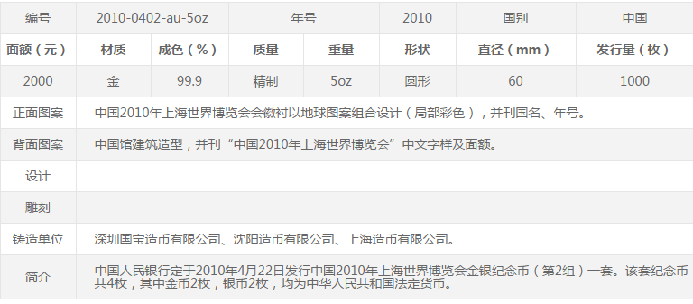 中国2010年上海世界博览会金银纪念章(第2组)5盎司彩色金质纪念章