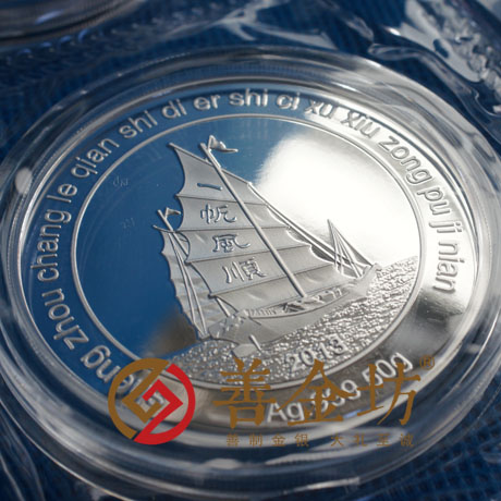 正面图案:镌有“嵊州长乐钱氏第二十次续修宗谱纪念”、“一世祖武肃王 钱镠 852-932” 字样及一世祖武肃王像图案。背面图案:镌有“sheng zhou chang le qian shi di er shi ci xu xiu zong pu ji nian”、“Ag.999 50g 2013”字样及一帆风顺图案。