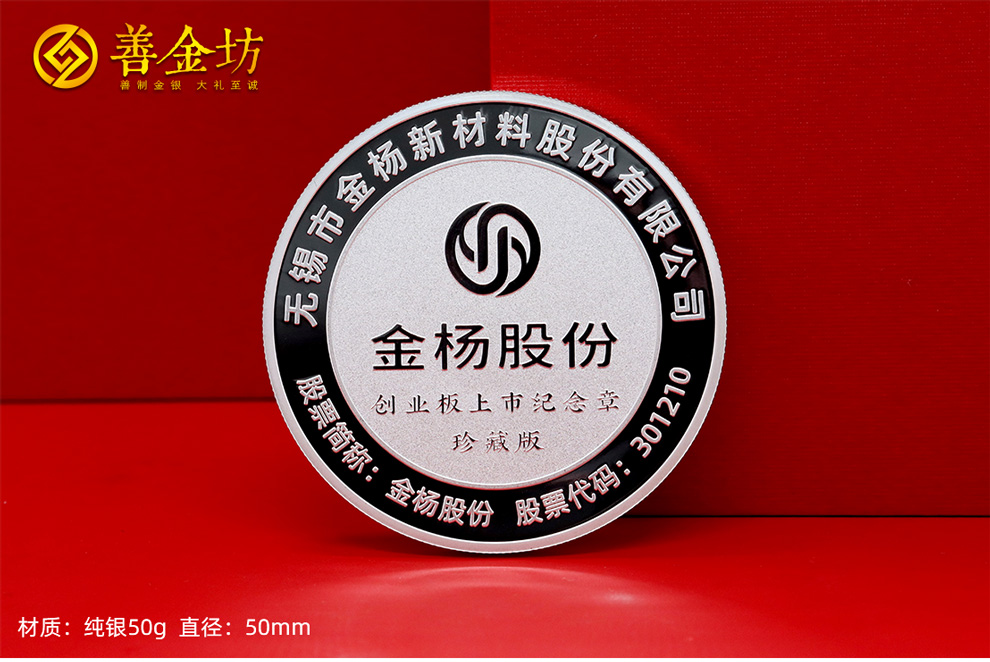 定制这款纪念章不仅是为了庆祝金杨股份在创业板成功上市,更是为了铭记这一重要时刻,彰显公司实力和诚信,增强投资者和员工的归属感和自豪感。此外,这款银章也可以作为礼品,赠送给重要的合作伙伴和客户,表达感谢和建立更深的商业联系。