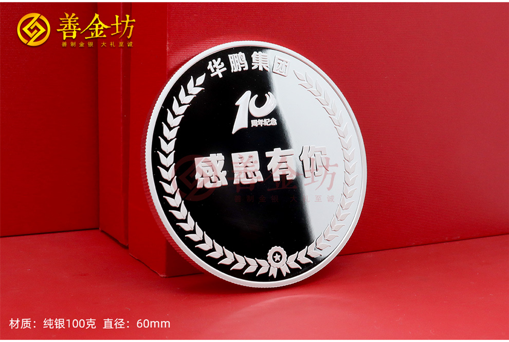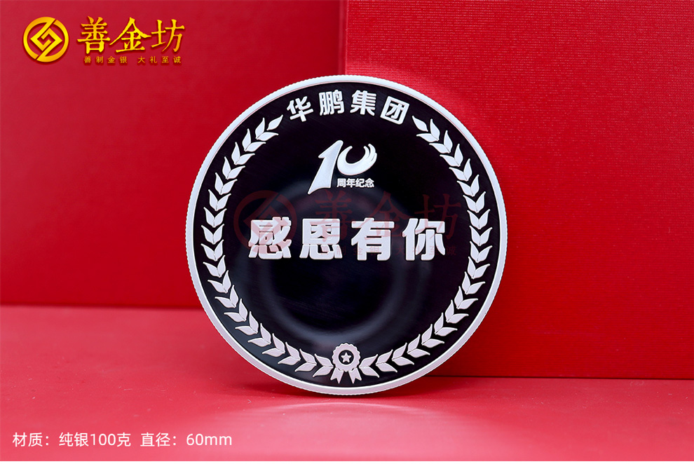 为纪念华鹏集团员工入职十周年,特制定了一款具有特殊意义的纪念章。这款纪念章直径为60毫米,含纯银100克,成色达99.9%,不仅具有一定的价值,更承载了企业对员工的感激与认可。
