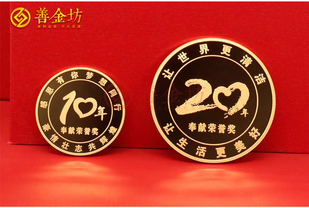 二十年纪念章则更为庄重,直径为35毫米,含有20克99.9%的纯金,寓意着入职二十年员工的卓越成就和无私奉献。纪念章上刻有“20年”字样,以及“让世界更清洁,让生活更美好”的标语,体现了公司致力于环保事业和追求美好生活的愿景,同时也展现了员工个人成长与公司发展的同频共振。