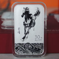 本有机盒一举打破以往单调的圆形有机盒,独特造型立体饱满,将神马表现得栩栩如生,与内嵌3D马年银条相统一,完美契合,内外呼应。整款有机盒大到外部整体形象,小至马尾鬃毛、腿部肌肉及祥云图纹的精致线条,无不展现着细致入微的精湛高浮雕磨砂工艺。