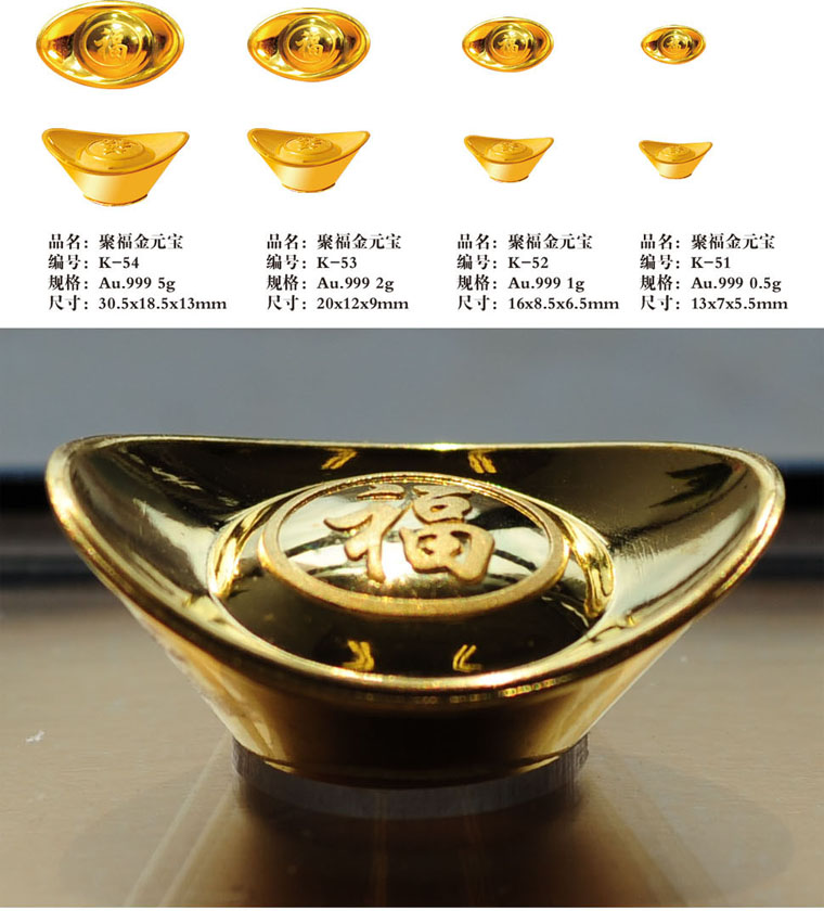 聚福金元宝圆顶有闪耀“福”字踞中央,寓意福运常驻,财源广聚!5g/2g/1g/0.5g四种规格,让您轻松拥有多重选择!小克重,千足金,以先进工艺精致打造,彰显广聚财源的大气场!千金一克,让您聚小成多!招财聚福,值得一生典藏