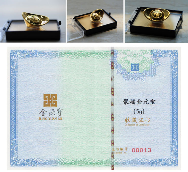 本品由金源宝公司荣誉出品,倾情呈现!每锭元宝均经由国家金银制品检测中心权威检测认证并附有证书,同时附有金源宝公司出具的唯一编号的收藏证书及产品说明书。聚福金元宝富于祥瑞寓意,工艺精美绝伦,是您经典收藏和礼赠亲朋的首选礼品!
