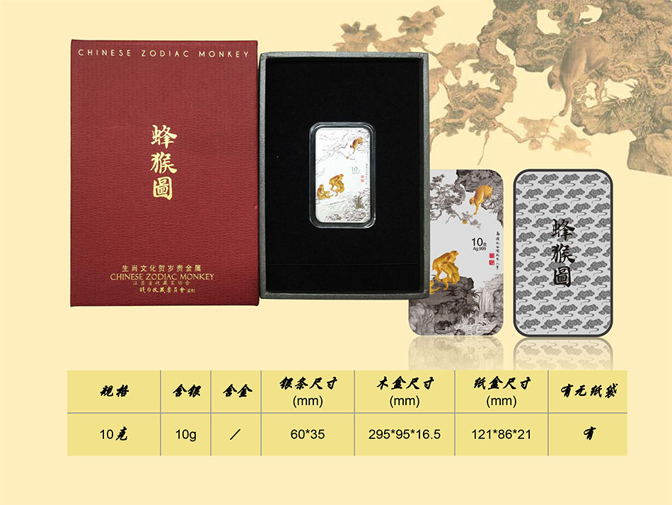 蜂猴图,采用先进造币工艺,保证在同等克重下,金银条面积达到最大限度,同时可以运用浮雕等工艺保证画面的立体感和层次感,大气震撼,细节考究。