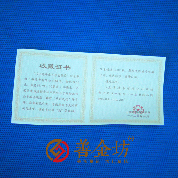 正面图案:清朝宫廷画家郎世宁的绘画作品骏马造型,镌有“马到成功”等字样,局部彩色印制;