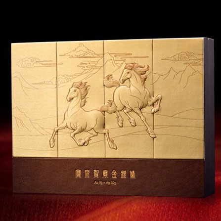 马年贺岁彩色金银条套装,每套两枚,金条规格32.5*12毫米,成色Au.999,含纯金1克;银条规格70*26毫米,成色Ag.999,含纯银10克,限量发行50000套。成色标准,重量合格,质量精致。