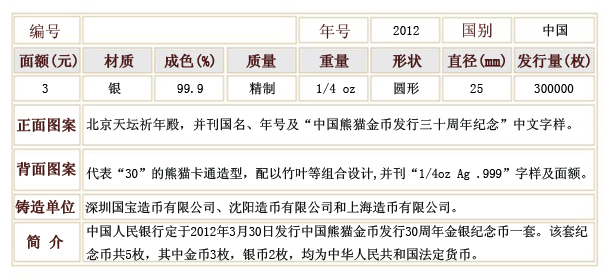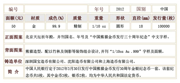 2012年中国熊猫金币发行30周年金银纪念币(金1/10盎司+银1/4盎司)