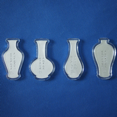 “四季平安银条”(青花)采用Ag.999足银打造,呈花瓶边廓,外观仿青花瓷设计,四款经典瓶型——观音瓶、赏瓶、柳叶瓶、梅瓶。正面花卉图案分别为兰、荷、菊、梅,对应春夏秋冬四季。背面配以寓意平安的诗句,诗画组合将美好祝愿深深融入其中,意境深远,韵味十足。 观音瓶:平心有道天下顺,安享太平如意年;赏瓶:平稳事如意,安宁享四季;柳叶瓶:平和度春秋,安乐于人间;梅瓶:平心静气观世象,安泰祥和酝佳酿规格:20克*4块银条套装,有摆件 材质:Ag.999 包装:包装突出青花瓷的设计元素,色调以蓝色为主色,采用天然丝材质,其上丝印和烫金(银)工艺。