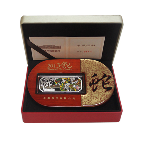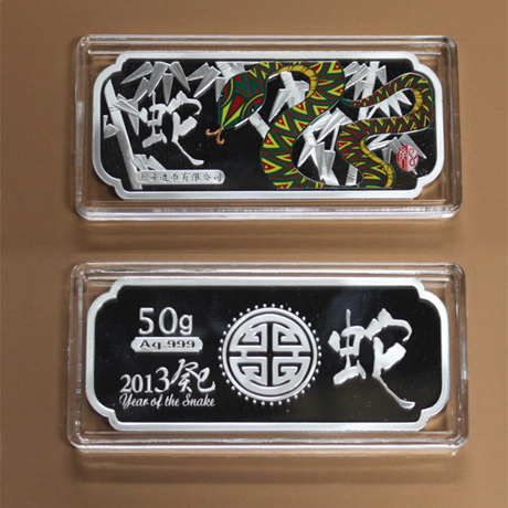 2013蛇年50彩色银条名称:2013蛇年彩色银条材质:纯银50克 Ag.999规格:70*30mm发行量:35000套铸造厂:上海造币有限公司实物图片如下: