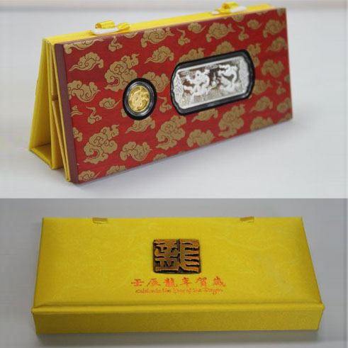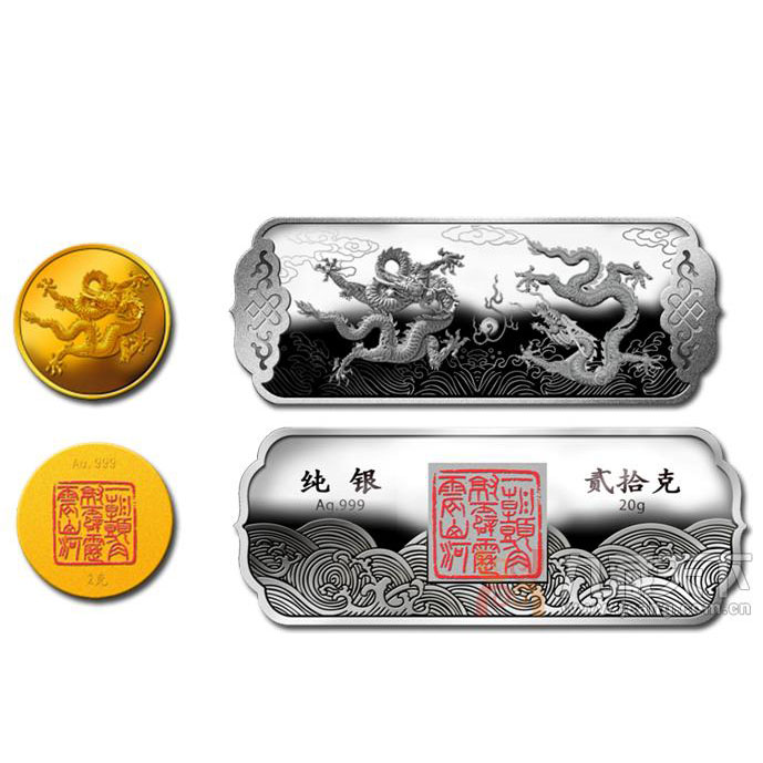 壬辰龙年贺岁金银套装 【名 称】壬辰龙年贺岁金银套装【材 质】纯银20克 Ag.999 纯金2克 Au.999 【规 格】【发行量】5000套【铸造厂】永银黄金【产品介绍】由20克贺岁银条与2克贺岁金章组合而成。银条正面图案取自“北海九龙壁”中第五和第六条龙,组合为“二龙戏珠”图案;背面为北宋文学家苏轼诗《起伏龙行》全文,中间位置彩印中国篆刻大师崔志强先生的篆刻作品一方(内容取自《咏龙诗》“一朝头角就,霹雳震山河”)。金章正面图案取自“北海九龙壁”正中间的一条龙--“九五之尊”,背面彩印中国篆刻大师崔志强先生的篆刻作品一方(内容取自《咏龙诗》“一朝头角就,霹雳震山河”)。