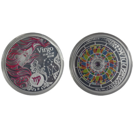 十二星座之处女座60克彩色银章【名 称】处女座彩色银章【材 质】纯银 Ag.99.9﹪【规 格】60克银章 直径60mm【铸造厂】上海造币有限公司
