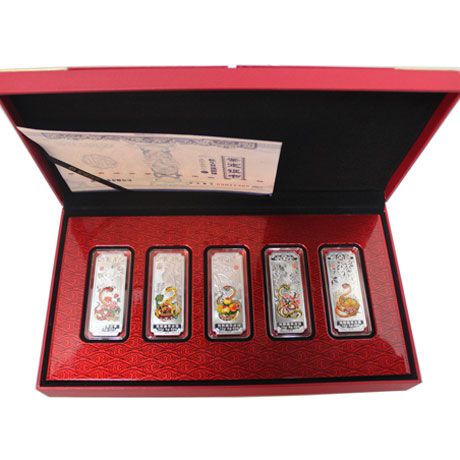 【藏品赏析】蛇是华夏民族最古老的图腾文化之一,它代表睿智,冷静,是权势,智慧,长寿与财富的象征,于十二地支中位列第六,遂称巳蛇。公元二零一三年,时至癸巳生肖蛇年。岁在癸巳,银蟒降幅,【福禄寿喜财】蛇年贺岁银条套装,正面五彩灵蛇身披祥纹,口衔吉瑞,环绕于象征传统【五福】的富贵牡丹,吉祥如意,福寿蟠桃,延喜春梅和聚宝琉璃坛之间,呈招财镇宝之势,寓意癸巳丰年大吉,五福同享。背面分别书【福禄寿喜财】五字,搭配蝙蝠,鹿,仙鹤,喜鹊,金蟾等吉祥元素,取【莽原新锐蕴生机,银蛇跃动送五福】之意,以银条的清丽典雅,喻癸巳之新年气象。【福禄寿喜财】蛇年贺岁彩色银条由宝泉钱币投资有限公司(上海黄金交易所综合类会员)铸造发行。蛇年贺岁彩色银条套装,正面为五条彩蛇分别盘踞于象征【福禄寿喜财】的牡丹,如意,蟠桃,喜梅,财宝之间;背面分别书【褔】【禄】【寿】【喜】【财】五字于蝙蝠,鹿,仙鹤,喜鹊,金蟾等吉祥元素间。蛇年贺岁彩色银条套装。每套5枚,规格65*24毫米,成色Ag.999,含纯银100克,限量发行100000套。成色标准,重量合格,质量精制。