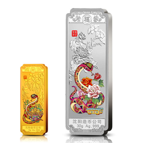 【品 名】2013生肖蛇年5克金+30克银套装【材 质】999千足金5克、999千足银30克【发行量】5万套【包 装】高档包装盒,配防伪编号收藏证书【铸 造】沈阳造币有限公司