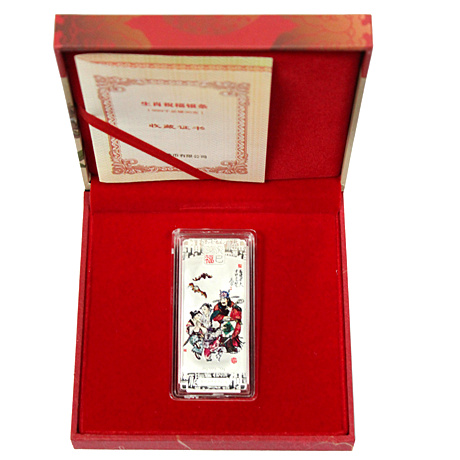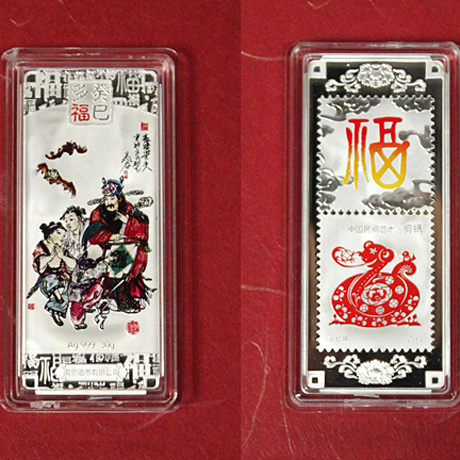 【名 称】生肖祝福喜庆银条【材 质】纯银30克 Ag.999 【规 格】30X70mm【铸造厂】南京造币厂【发行量】20000套【产品介绍】该套银条正面图案分别为中国传统文化吉祥寓意的“福星”、“禧星”国画及画家题词,上书“癸巳多福”和“癸巳多禧”字,以及祥云图案。凸现生肖“福银”的艺术效果,寄托美好祝福。