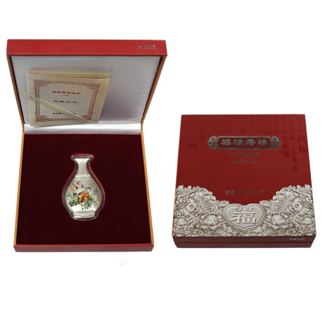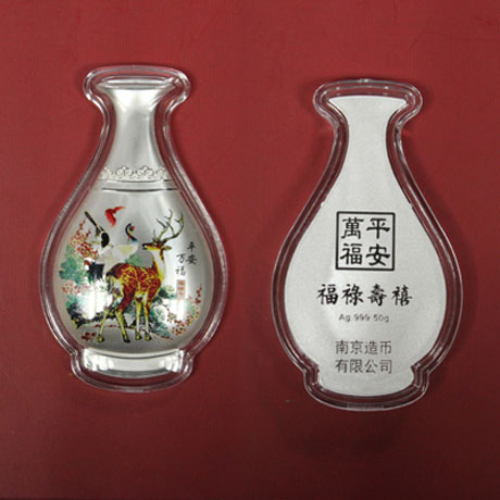 【名 称】福禄寿禧银条【材 质】纯银50克 Ag999【规 格】70X37mm【发行量】20000套【铸造厂】南京造币厂【产品介绍】该枚银条以“花瓶”造型进行设计,用半立体浮雕风格的精铸工艺与造币工艺结合制造,银条图案为中国民俗祝福文化中象征“福禄寿喜”的蝙蝠、梅花鹿、丹顶鹤、喜鹊,以及祝福语“平安万福”、“福禄寿禧”。