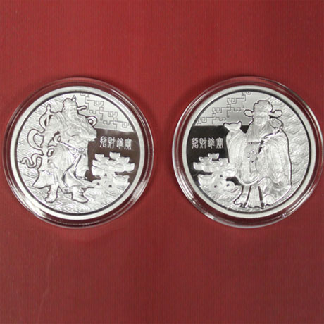 【名 称】招财进宝银质双枚章【材 质】纯银(1盎司X2枚)Ag999【规 格】40mm【发行量】6800套【铸造厂】南京造币厂【产品介绍】正面图案分别以中国传统文化中的“文财神”--财帛星君、“武财神”--关圣帝君,结合“招财进宝”文字、元宝。古钱币、祥云等图案进行构图设计,寓意家庭幸福、富裕安康、事业兴旺、财源广进、礼信天下、海纳百川。背面图案统一为“招财进宝”艺术书法文字