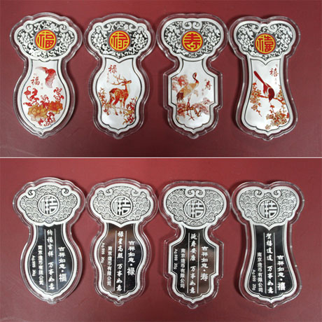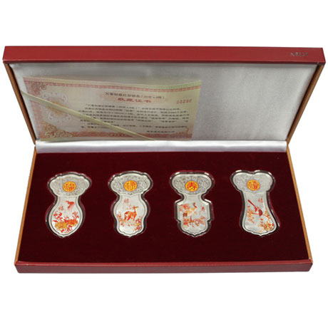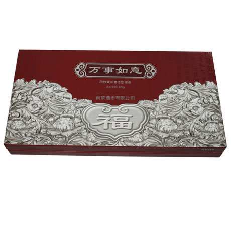 【名 称】万事如意红彩银条套装【材 质】纯银80克(20克X4枚) Ag999【规 格】70X38mm【发行量】20000套【铸造厂】南京造币厂【产品介绍】该套红彩银条分别以四种“如意”造型进行设计,用半立体浮雕风格的精铸工艺与造币工艺结合制造,四枚银条图案分别以红彩瓷风格表现的中国民俗祝福文化中象征“福禄寿喜”的蝙蝠、梅花鹿、丹顶鹤、喜鹊和相对应的祝福语“纳福吉祥”、禄星高照、延寿安康、贺禧连连”。
