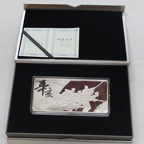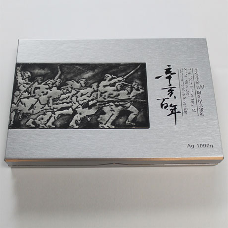 【名称】辛亥革命100周年公斤大银条【材质】纯银99.9﹪【重量】1000克【规格】直径100mm【发行量】2000枚【铸造厂】上海造币有限公司【总经销】中国金币总公司【产品介绍】正面:印有革命起义军向前冲的图样,以将书法“辛亥”二字以醒目的方式表现。并以小字印有“辛亥100周年纪念 1911-2011”字样。背面:以孙文(孙中山)题字:“天下为公”横幅。体现了当时革命军人对社会的一种美好向往的政治理想。