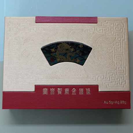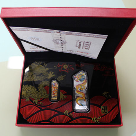 【名称】龙年贺岁彩色金银条套装【材质】纯金99.9﹪ 纯银99.9﹪【重量】金5克 银28克【规格】金11.5*37mm 银23.5*76mm【发行量】5万【铸造厂】沈阳造币有限公司【正面图案】为赤金二龙盘延而上,辅以中国传统祥云纹饰,并书“壬辰”年号 【背面图案】书吉祥祝福语“金龙降喜”和“银龙吐财”