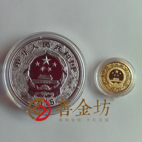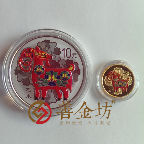 【名称】2015羊年圆形彩色金银纪念币(套装)【面额】 银币10(元) 金币50(元) 【材质】 金 银【成色】 99.9% 【质量】 精制【重量】 银币1oz 金币1/10oz 【形状】 圆形【直径】 银40mm 金18mm【发行量】 金120000枚 银220000枚 【正面图案】中华人民共和国国徽衬以连年有余吉祥纹饰,并刊国名、年号。 【背面图案】中国民间传统装饰羊造型衬以吉祥纹饰(局部彩色),并刊面额及“乙未”字样。【图片赏析】