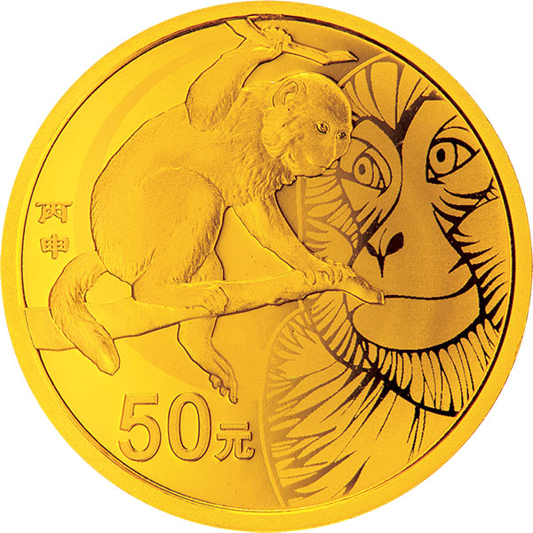 正面图案:中华人民共和国国徽衬以连年有余吉祥纹饰,并刊国名、年号。背面图案:写实猴造型衬以装饰猴纹样,并刊面额及“丙申”字样。铸造单位:深圳国宝造币有限公司、沈阳造币有限公司、上海造币有限公司。