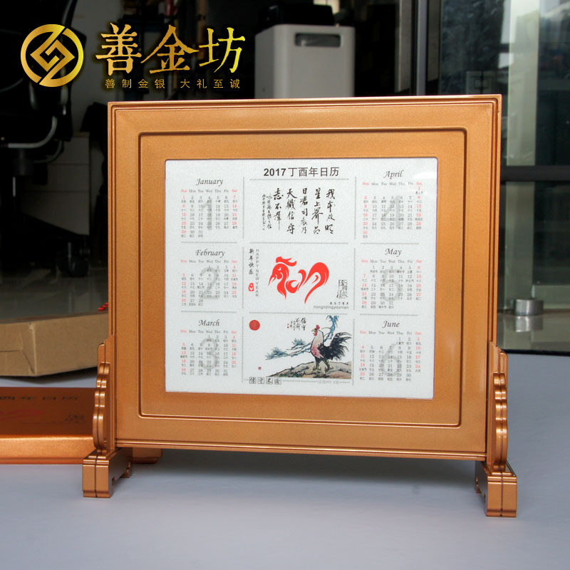 新款2017鸡年纯银台历 金鸡报福8克创意日历架办公摆件新年礼物
