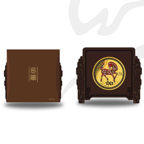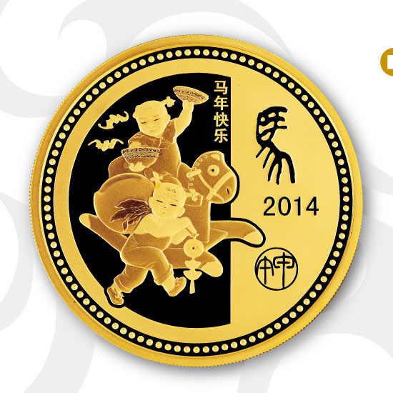 银蛇摆尾辞旧岁 福马呈祥报春来《易经》所载:“乾为马”,乃天之象征,乾卦又称龙卦,“龙马”一词由此而生,喻精进刚猛之意。龙不可遇,但龙马长存,作为中华民族的精神所向,马被人们赋予了圣贤与能者的情感色彩,也是王者风流和英雄精神的象征。民族精神 千年传承 中华民族自古便以“马”之形喻民族精神,其刚健、升腾、饱满、昌盛的象征意义,诠释了华夏子孙千百年来的精神面貌。甲午马年的到来,也因此被寄托了无限升腾的美好期许与昂扬斗志。宝泉钱币始终坚持并不懈努力以贵金属的表现形式、艺术品的典藏方式,继承、弘扬中国生肖传统,同事实现国粹经典文化的永久收藏。设计说明:正面图案:装饰性彩绘马造型,局部彩色印制。背面图案:儿童骑木马,镌有“马年快乐”、“马”字书法体、“2014”年份以及“甲午”字样。材质:.9999Au 规格:直径60毫米 重量:5盎司