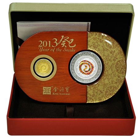 2013蛇年金银章 1克金2013年生肖蛇年金银章套装,由上海金源宝工艺收藏品有限公司为迎接公元2013农历癸巳蛇年而铸造发行包含直径...